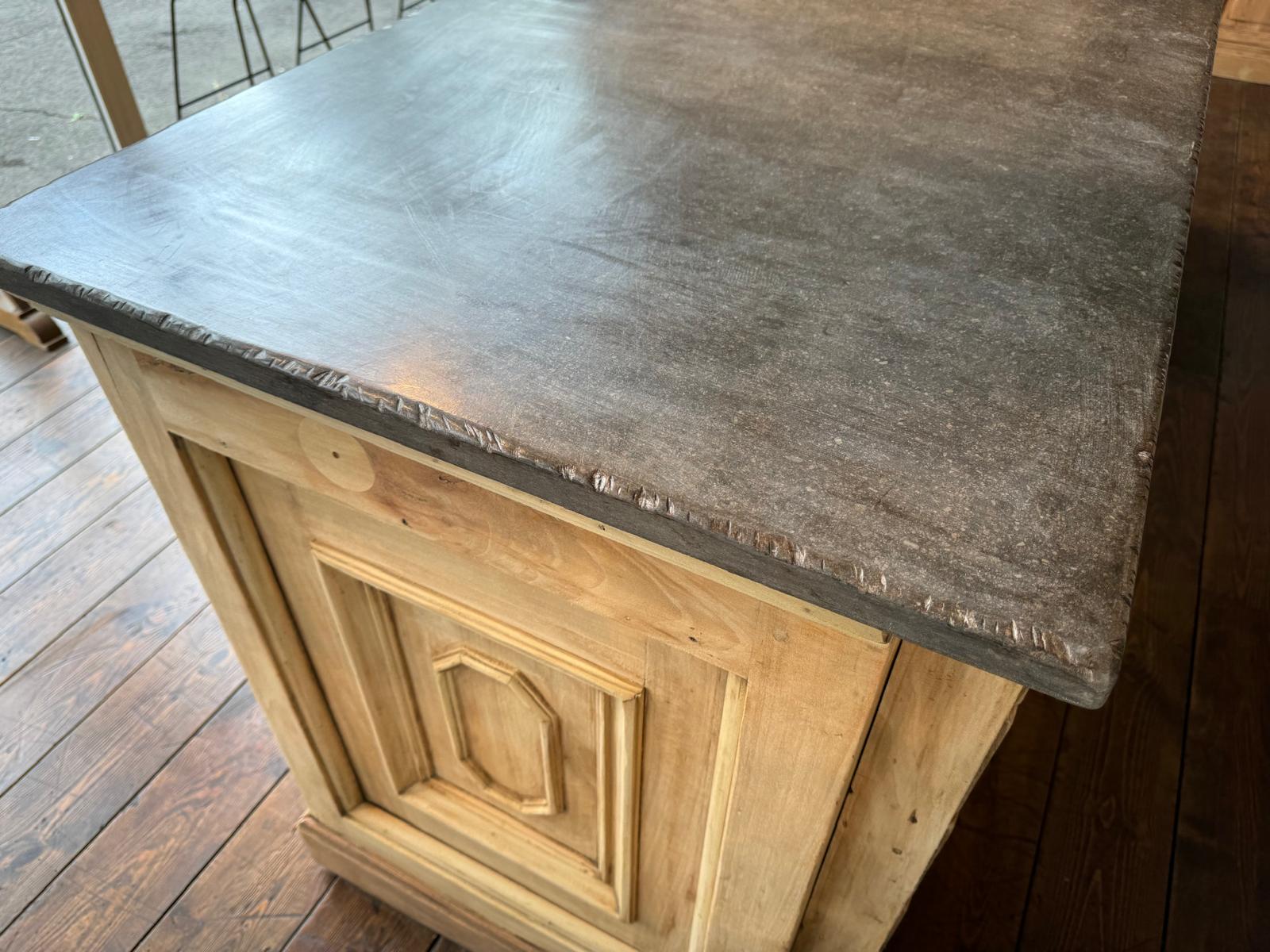 Au fil des ans, ce comptoir a subi de nombreuses transformations, chaque compartiment cache une histoire. En effet, ils ont été modernisé pour optimiser leur utilisation en pharmacie. Pour garder l’aspect fonctionnel, nous avons préservé la structure des tiroirs tout en rénovant complètement leurs faces avec du bois massif, redonnant ainsi vie à ce magnifique meuble. La tablette en pierre bleue, soigneusement nourrie, ajoute une touche d’élégance et de douceur au toucher.