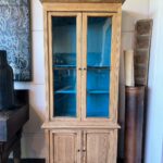 Cette vitrine 2 corps en pitchpin à encore ses anciens carreaux en verre soufflé. Les barres qui séparent les vitres ainsi que les boutons sont en métal. L'intérieur bleu donne un joli contraste avec le bois brut de la vitrine.