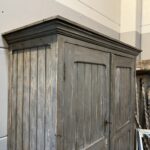 Cette ancienne armoire servait de vestiaire dans un atelier. Elle sera idéale dans un hall d'entrée, dans un dressing, etc. Ses rangements spacieux et bien agencés vous offrent plein de possibilités. Les étagèrent peuvent facilement se mettre à des niveaux différents. Sa patine couleur gris bleuté change selon la luminosité.