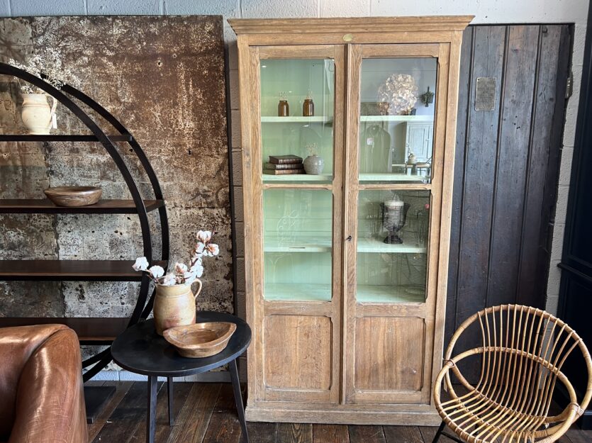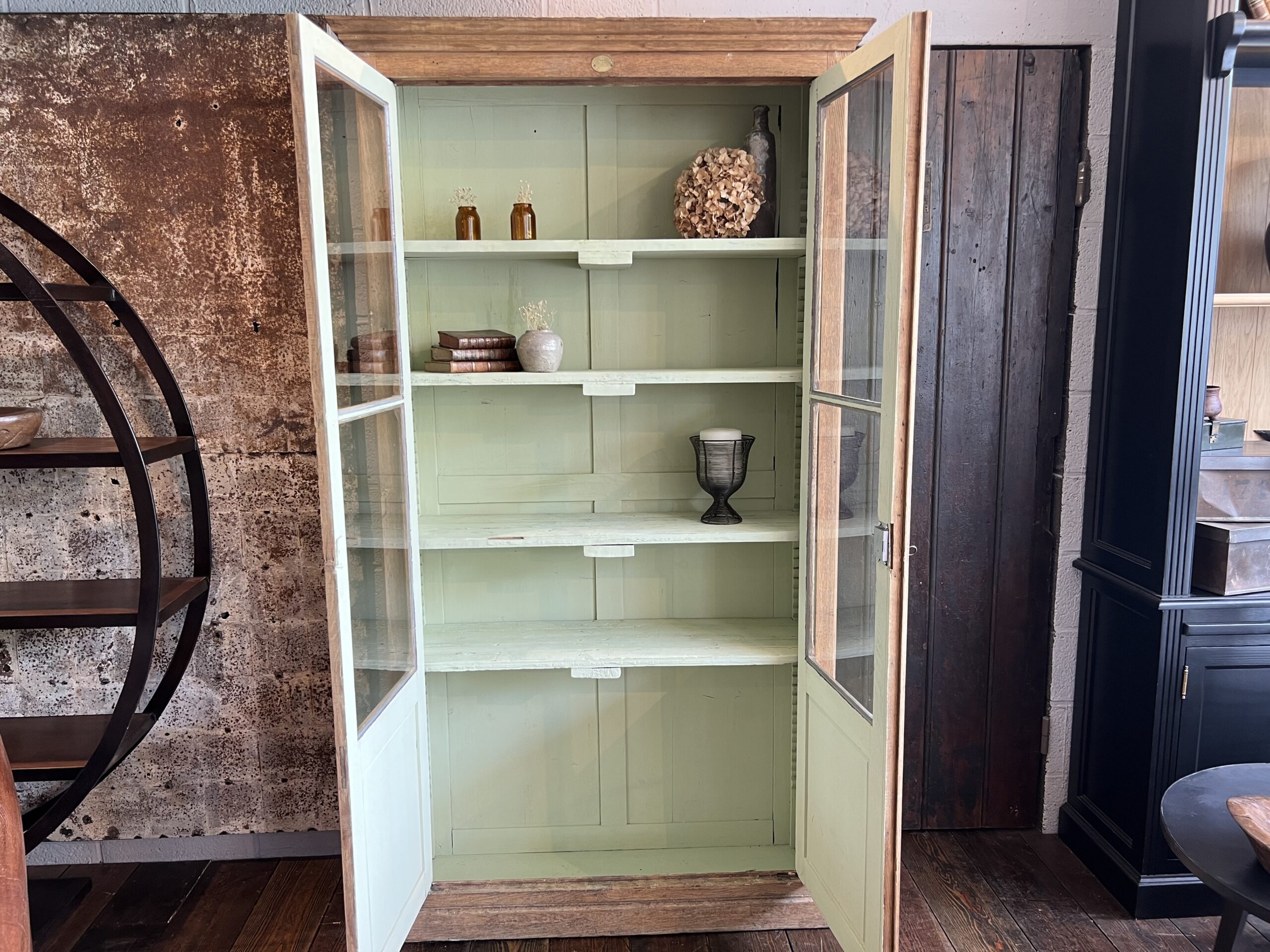 Ancienne armoire vitrée en chêne massif des années 1950. Son style et ses lignes forte donneront du caractère à votre décoration d'intérieur. L'extérieur est en bois brut tandis que l'intérieur a été peint dans une couleur douce et moderne pour jouer avec un contraste qui permettra de mettre vos objets en valeur.