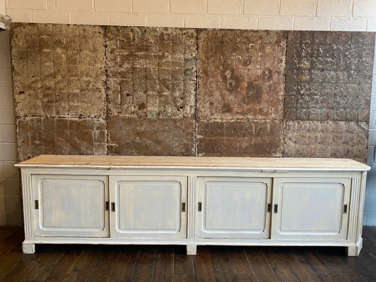 Ancien arrière-comptoir de boulangerie, délicatement patiné pour lui conférer un charme unique. Sa tablette en bois brut ajoute une touche lumineuse à ce superbe buffet, créant ainsi un équilibre harmonieux entre l'authenticité du passé et l'élégance contemporaine. Faites de cet élément de charme le point central de votre espace.