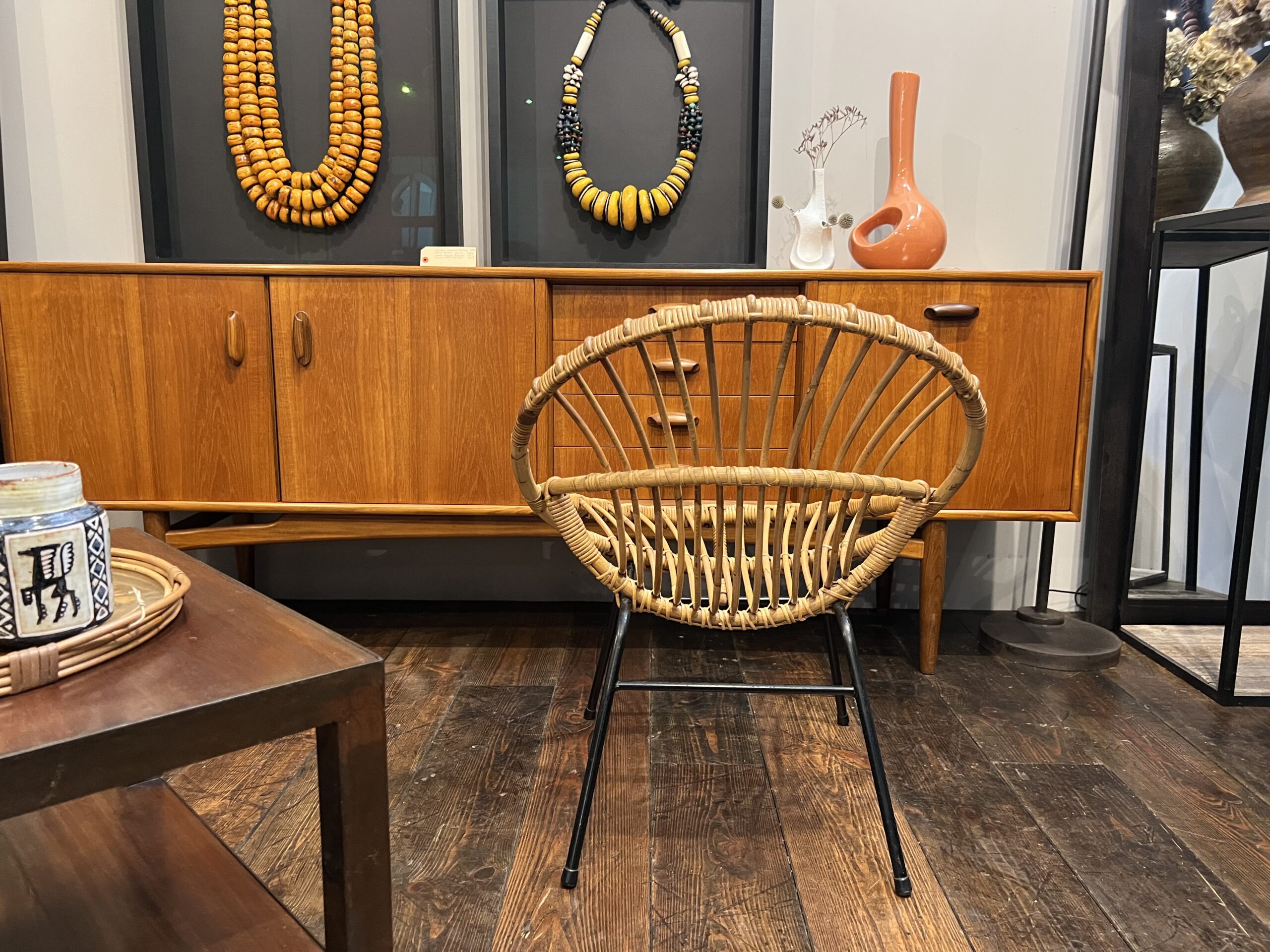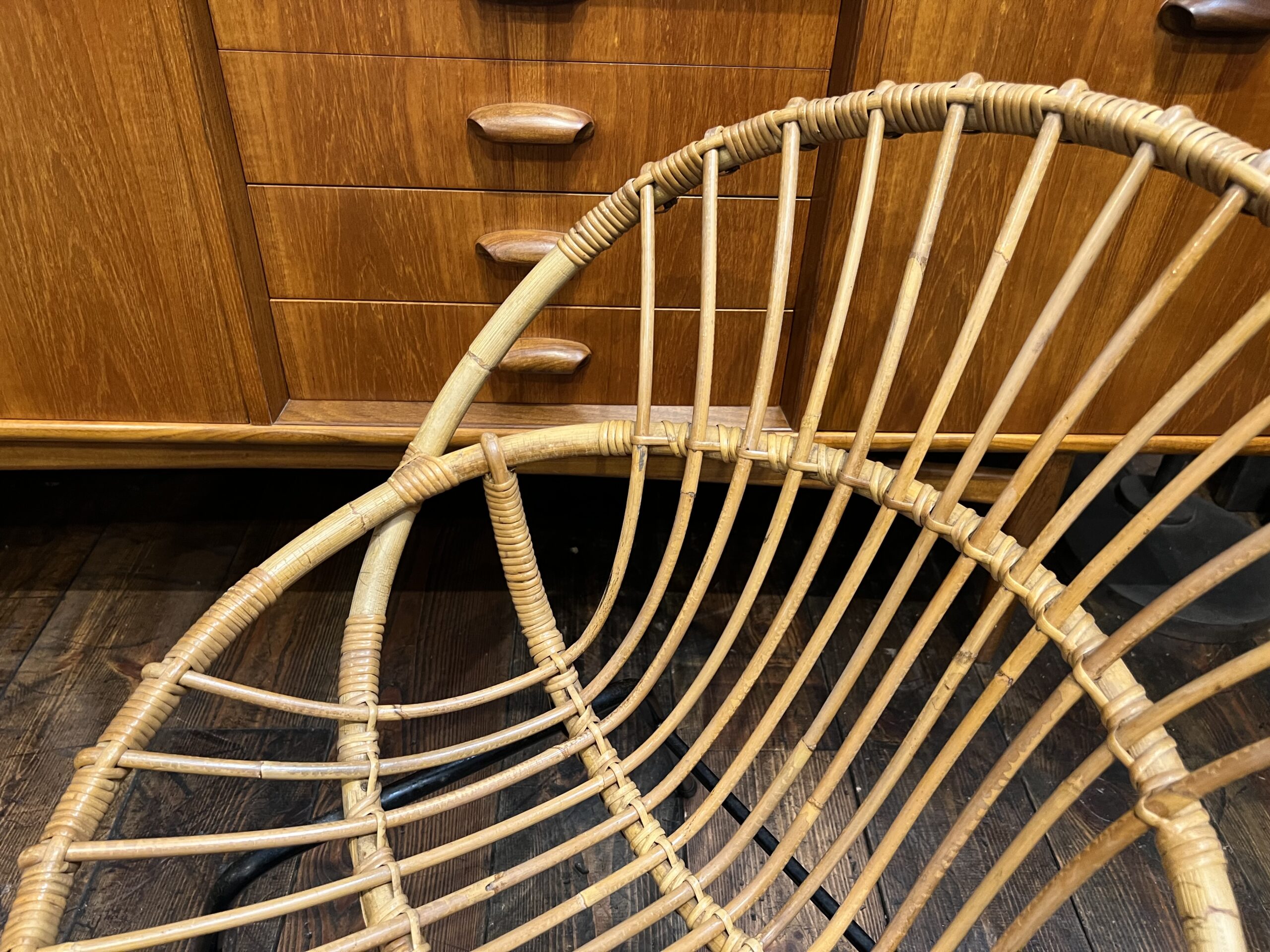 Fauteuil coquille en rotin avec pieds en métal noir.