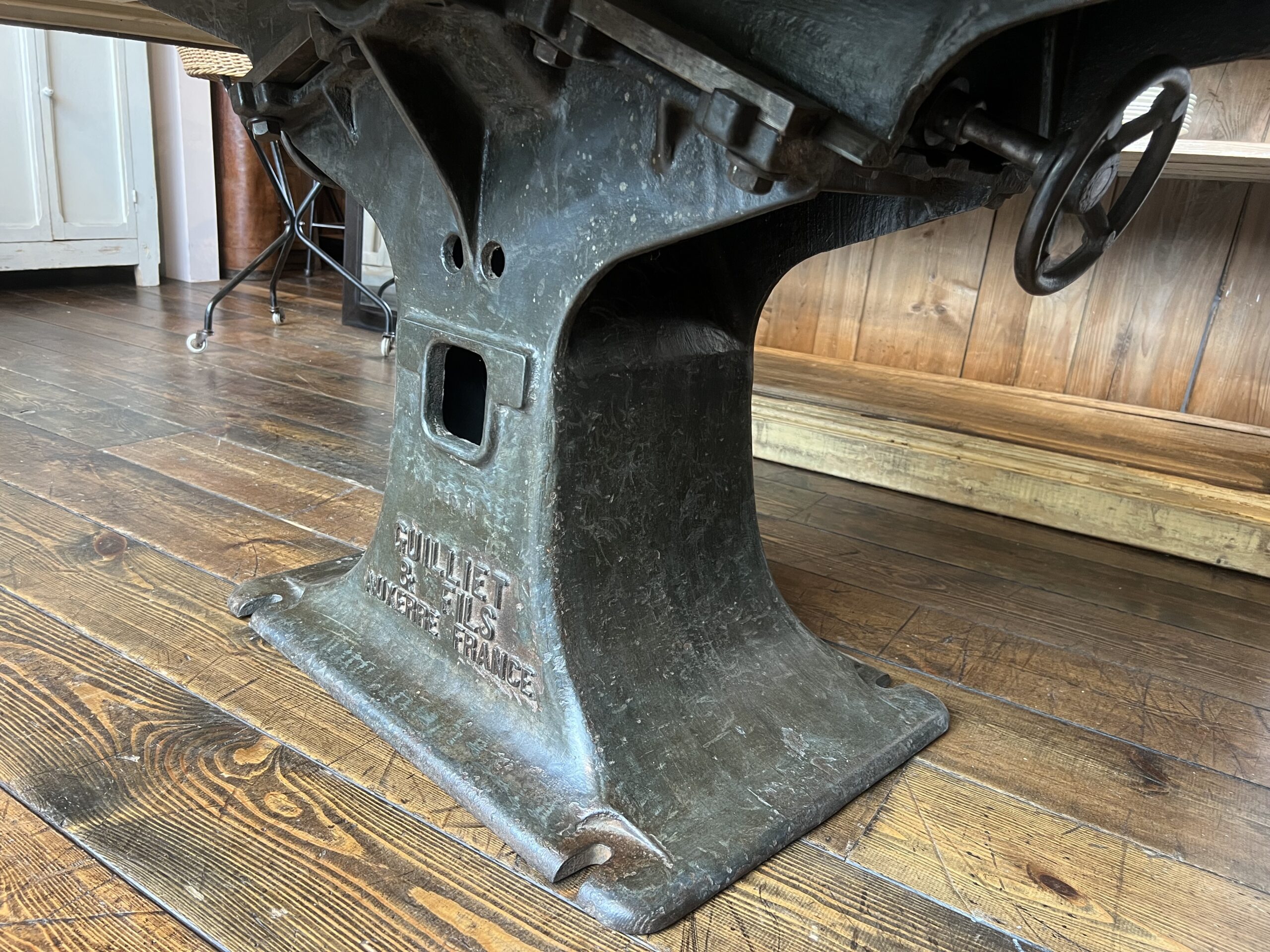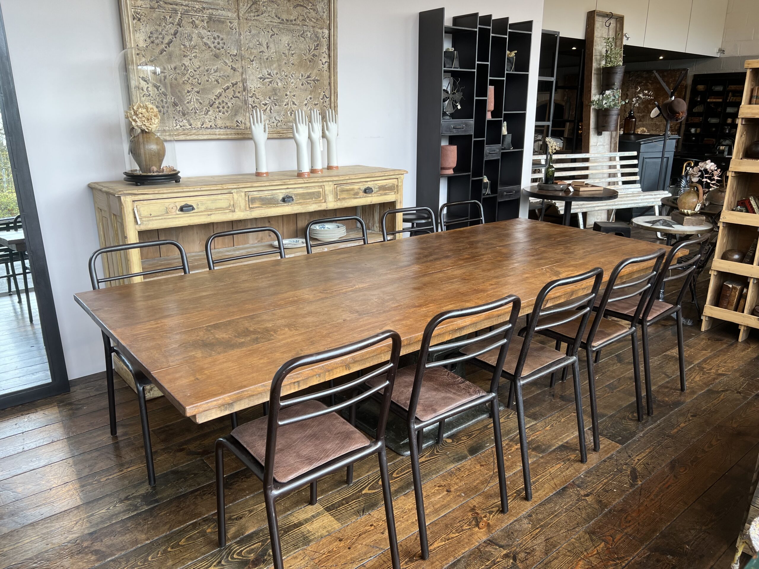Cette grande table peut accueillir jusqu'à 12 convives. Elle a été réalisée avec un ancien piètement de machine industriel joliment patiné. Il a 2 volants de chaque côté. Quant à la tablette, celle-ci a été réalisée avec un ancien parquet en teck d'un temple balinais. Ces détails en font une pièce unique et authentique. Le bois lisse est très agréable au toucher et il a une  jolie couleur qui donne beaucoup de chaleur à cette table industrielle.