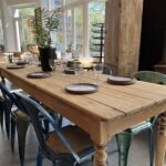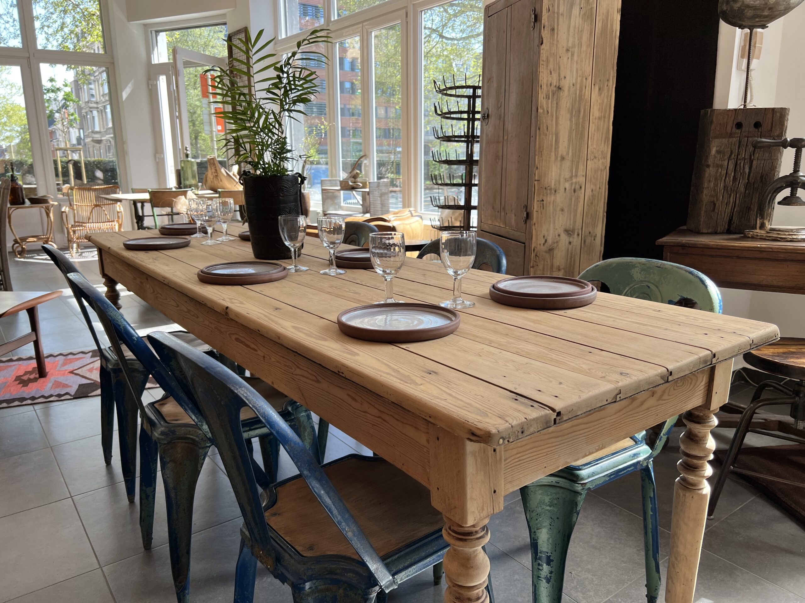 Table à manger de 8 personnes. Les pieds ont reçu des greffes pour rehausser la hauteur de la table.