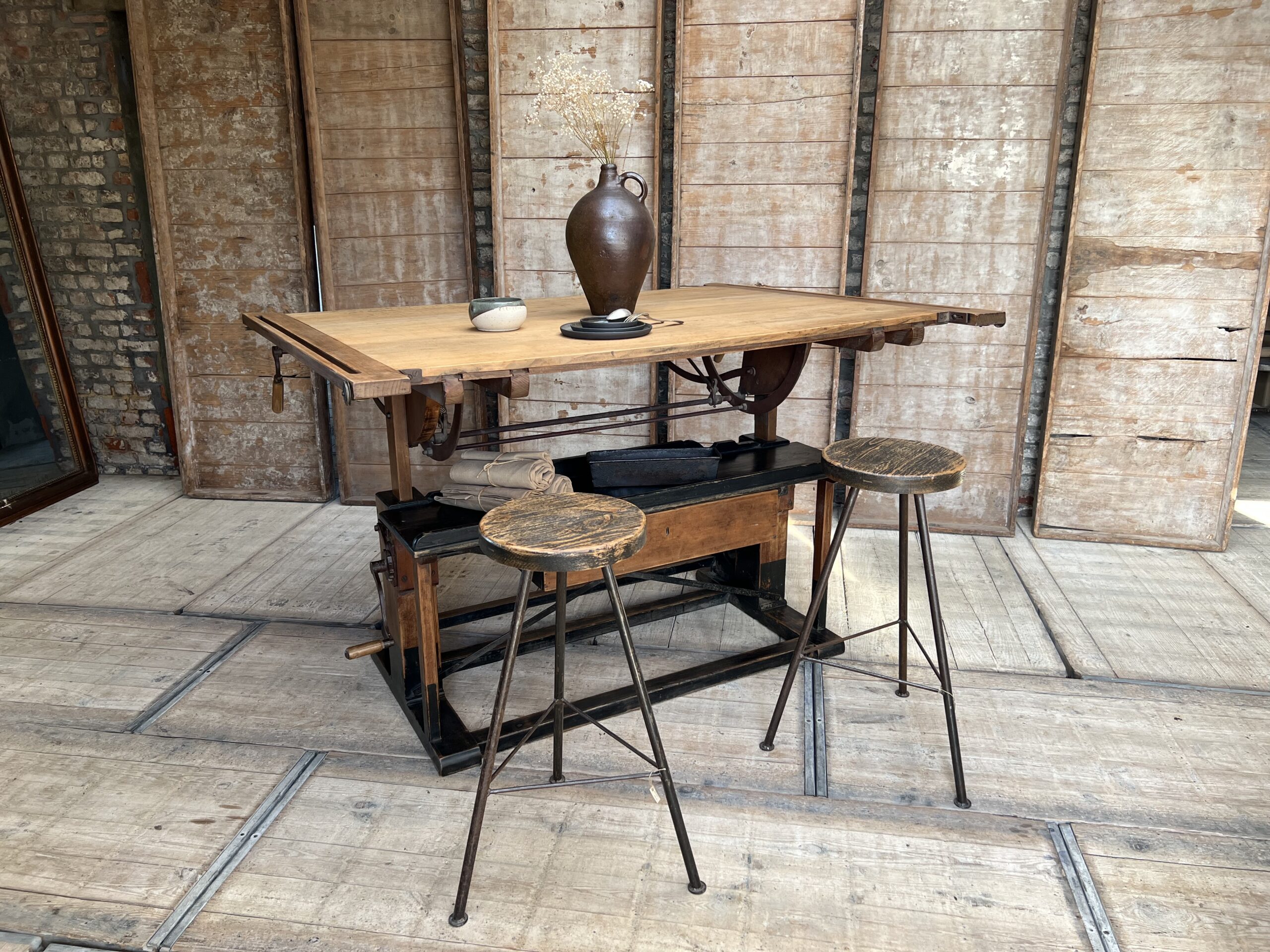 Ancienne table à dessin en bois avec son mécanisme en métal. Tiroir à l'arrière de la table.