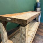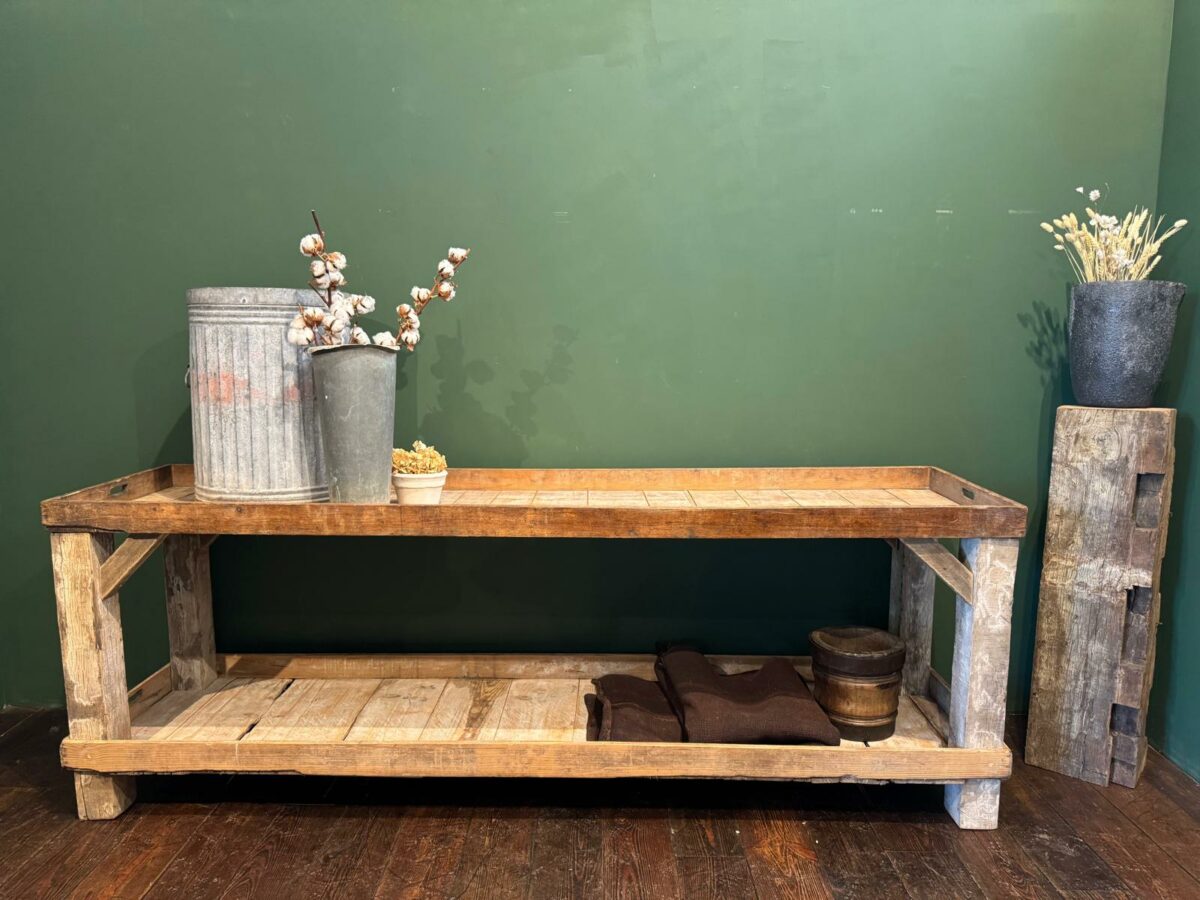 Découvrez notre magnifique table de fleuriste à deux niveaux, une pièce unique qui apportera charme et caractère à votre espace. Fabriquée à partir de deux grandes planches de boulangerie en bois provenant directement du Portugal et arbore une patine blanche délicate, témoin des années passées.