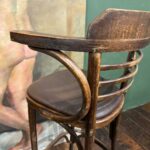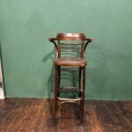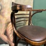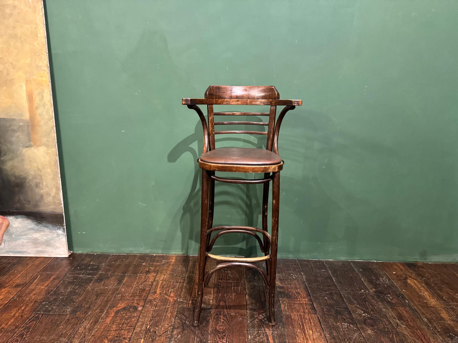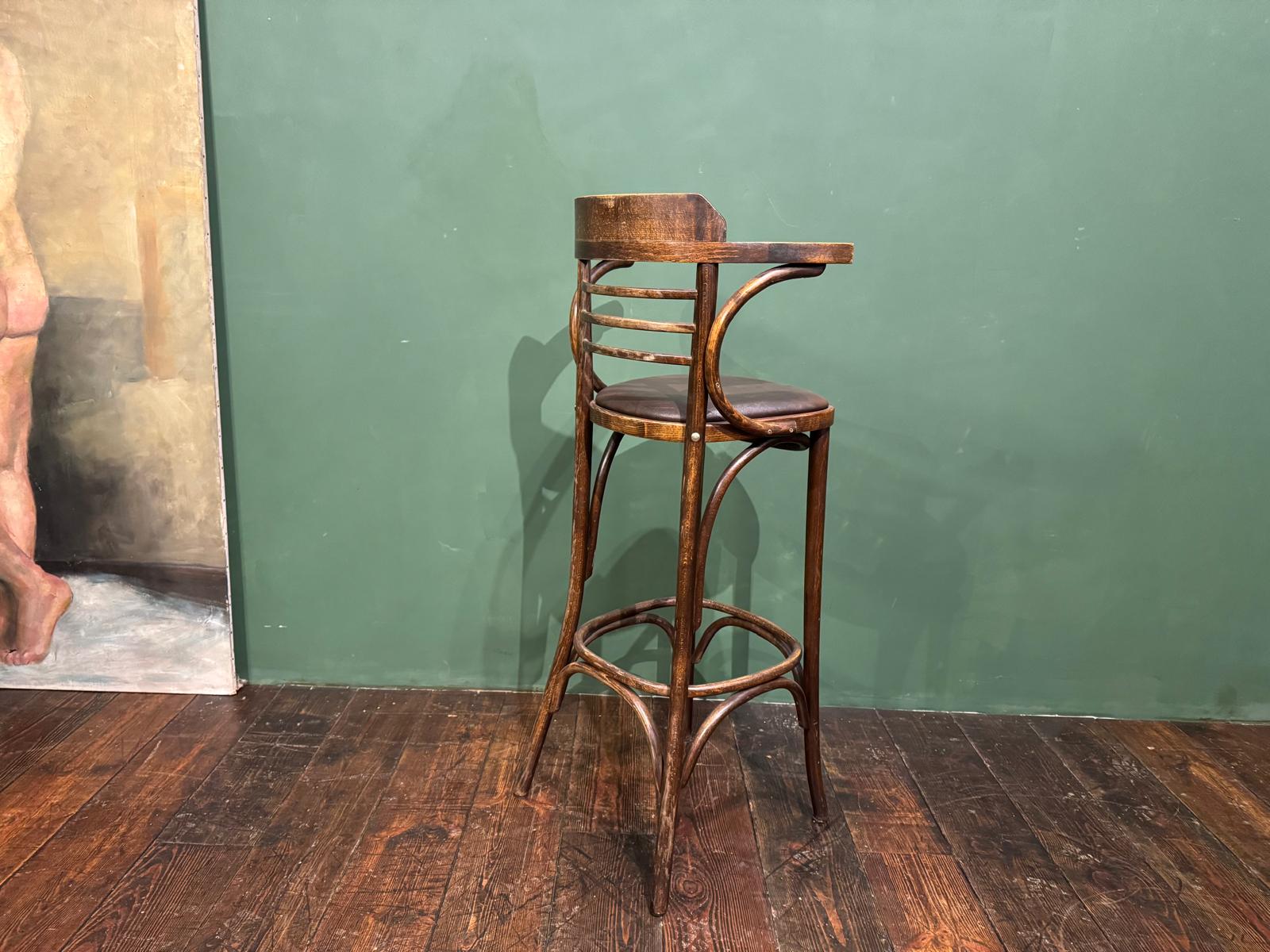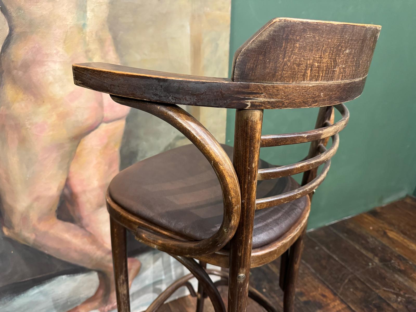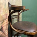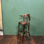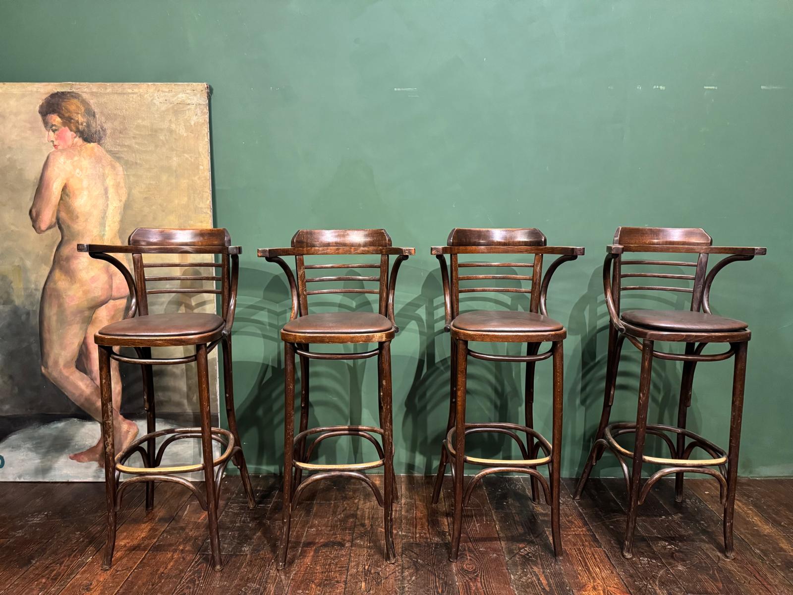 Cet ensemble de 4 tabourets de bar bistrot se distingue par ses galettes en simili cuir marron foncé, idéales pour instaurer une ambiance chaleureuse et de style pub anglais. Ce modèle avec accoudoirs et pieds en bois courbé apporte du caractère à vos espaces.