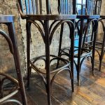 Chaises hautes de bars. Ces assises en bois pliés en bois foncé ont un look qui nous transporte dans les vieux bistrots parisien. Conçu pour allier confort et esthétique, ca tabouret est parfait pours le cuisines modernes, les bars animés, etc.